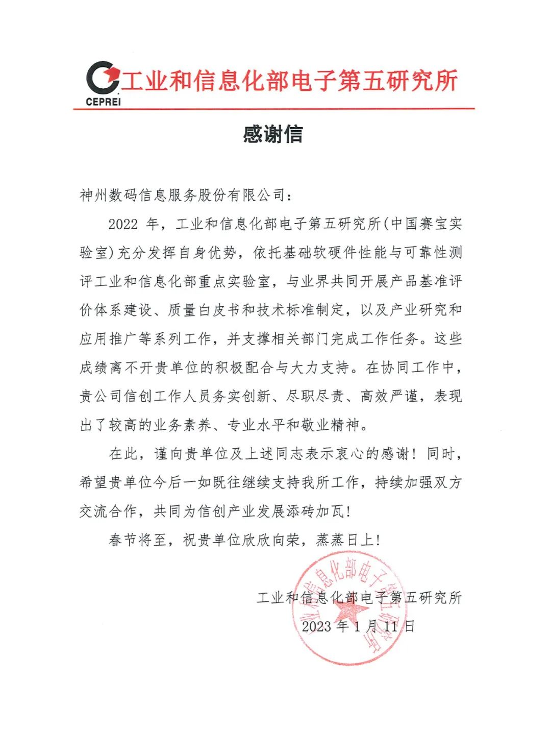 工业和信息化部电子第五研究所致神州信息的感谢信