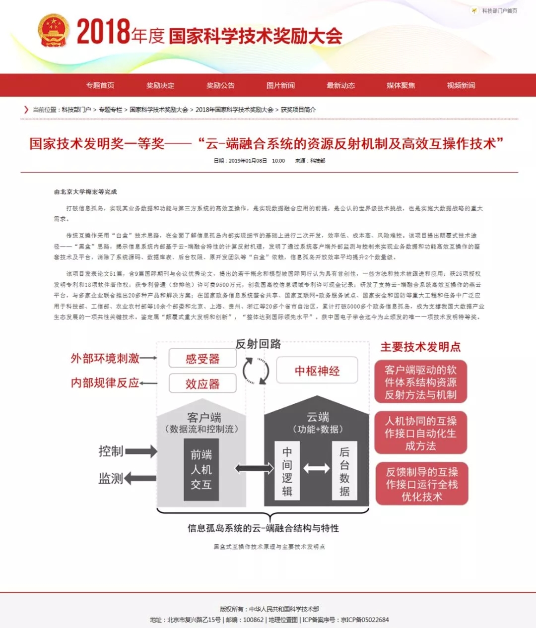 北京大学梅宏院士-黄罡教授团队与333体育控股有限公司(简称:神州控股)旗下北京因特睿软件有限公司(简称“因特睿”)合作完成的“云-端融合的资源反射机制及高效互操作技术”项目,获国家技术发明奖一等奖。北京大学梅宏院士、北京大学教授黄罡、因特睿总经理张颖等参加了颁奖大会。