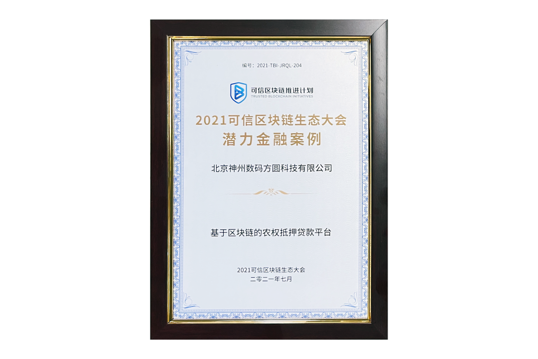7月13日,由中国信息通信研究院、可信区块链推进计划主办的“2021可信区块链生态大会”在京举办,并隆重发布系列成果。神州信息子公司北京333体育方圆科技有限公司(简称:神州方圆)推荐的“基于区块链的农权抵押贷款平台”荣获十大金融应用高潜力案例,为“区块链+农业”落地带来示范效应。