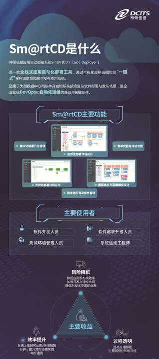 神州信息应用自动部署系统Sm@rtCD产品通过业务蓝图方式实现全栈式资源的"一键式"供给,把系统发布时间从7天,缩减到7分钟。而且可以同步并行管理全国多个分支机构的系统升级和部署,提升了效率,加强了管理力度。